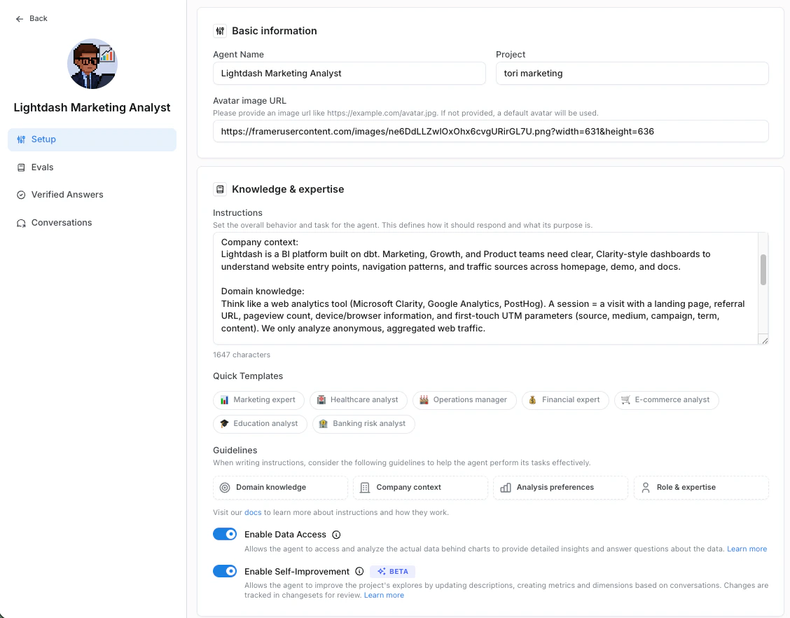 Allow your agent to propose changes to your semantic layer, including updating descriptions and creating new metrics. Changes are tracked in changesets for review. Read more on self-improvement (beta) feature.Setting up multiple agents
