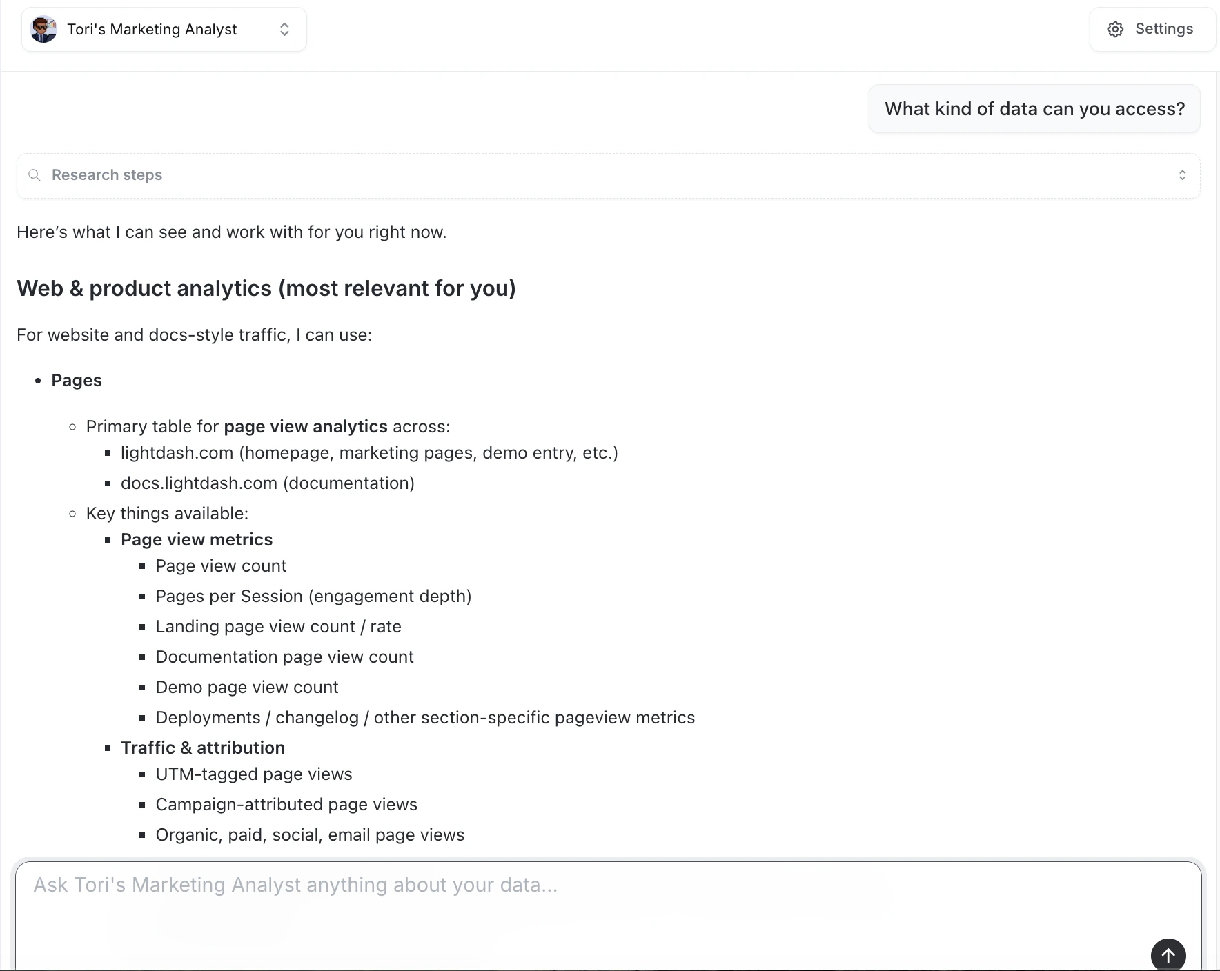 Once you’re set up - whether in the UI or in Slack - you can start asking questions immediately! Try asking “What kind of data can you access?” to get started: