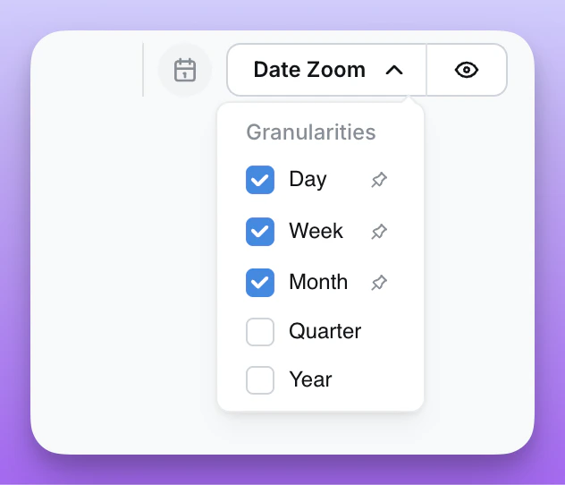 You can pin a granularity as the default that’s automatically applied when the dashboard loads:- In date zoom edit mode, click the pin icon next to a granularity