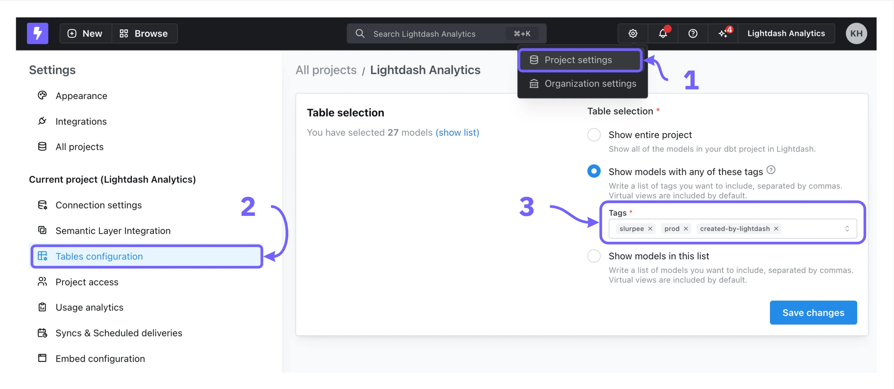 Show entire projectthen you don’t need to do anything. The models should appear automatically if you refresh your dbt project connection.Show models with any of these tags, you’ll need to addcreated-by-lightdashto the list of accepted tags. By default, models that you write back to dbt will have the tagcreated-by-lightdashincluded in the model config.Show models in this list, you’ll need to manually add the new models to the list of accepted models here.