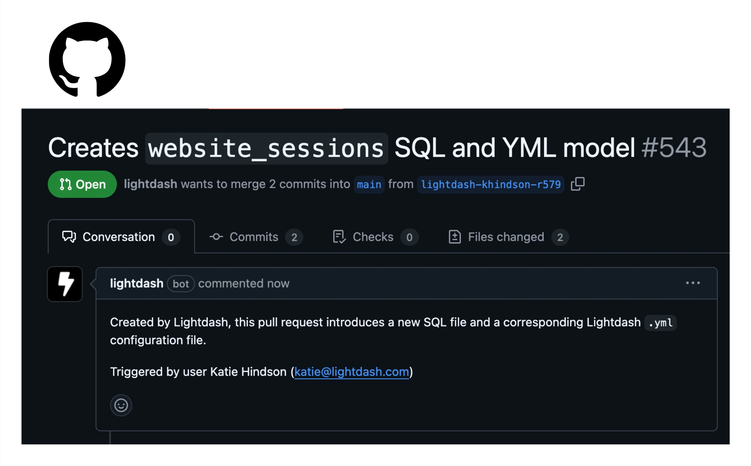 Open pull request will open a pull request created by Lightdash against your dbt project in GitHub or GitLab.