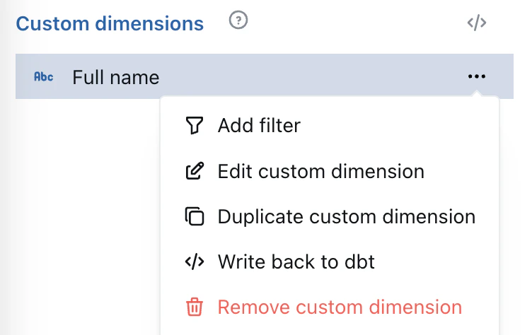 At the moment, if you write back a Custom Dimension to your dbt project’s YAML, the Custom Dimension will not be automatically replaced with the new YAML Dimension. Once your new Dimension is created in dbt, you’ll need to manually update your charts and replace the Custom Dimensions with the new Dimension.Write back dbt Models from the SQL Runner