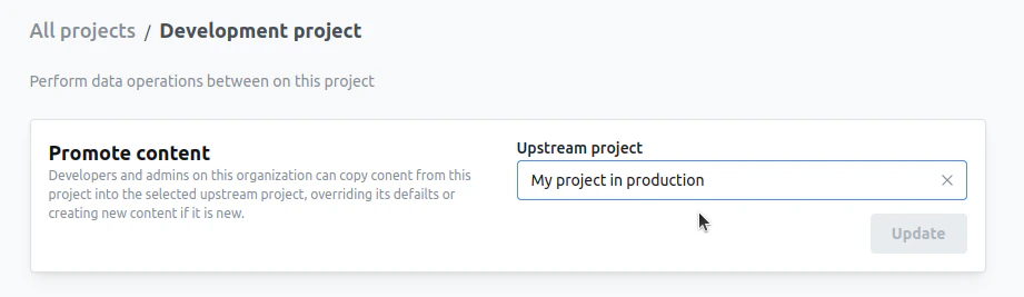 Before you can start promoting content, you need to configure your upstream project. To do this, on your development project go to settings > Data ops. Select the project where you want to copy the content to.