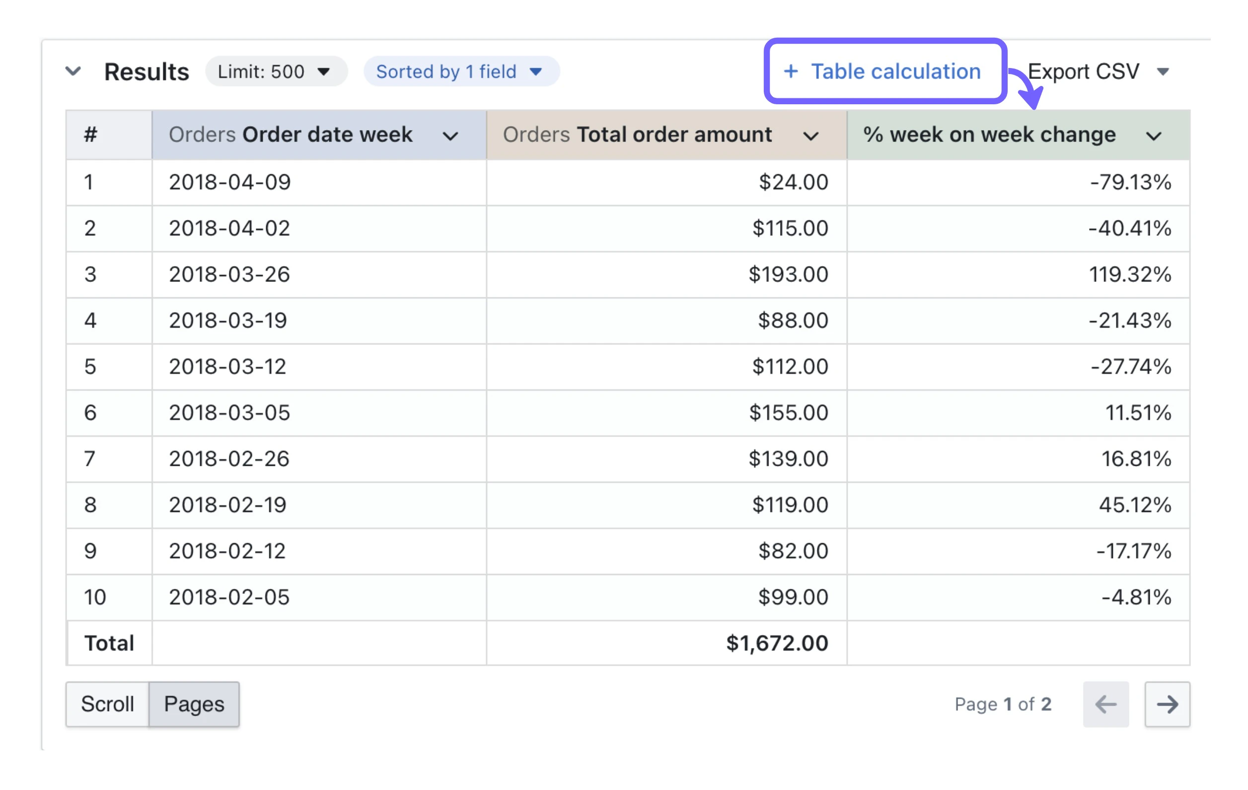 Since all calculations are performed before filtering, table calculation filters only hide rows without affecting the underlying calculations. For example: You use table calculations to calculate thepercentage_of_shipping_method_amount, then filter to hide rows below 30%. The filtered rows (shown in purple) will disappear but the percentage_total calculation still shows 100% even though the visible percentages in the percentage_of_shipping_method_amount column no longer add up to 100%.