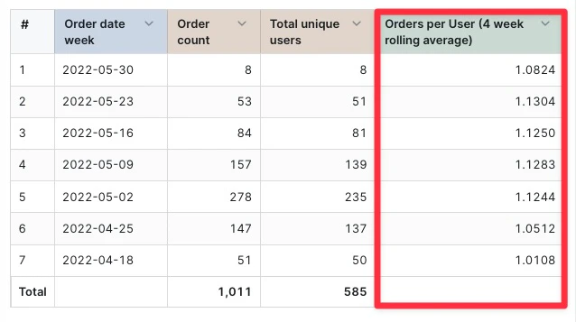 first_column_I_want_to_sumis the column with the values you want to add up (sometimes this is an average)column_I_want_to_order_byis the column you want to order by when defining your lookback windowNis the number of previous rows you want to include in your calculation (don’t forget the current row is included, so for a four week lookback window, we’ll use N=3)second_column_I_want_to_sumis optional, another column with values you want to add up to compare to your first column, like when calculating averages (which is how we use it in this example)