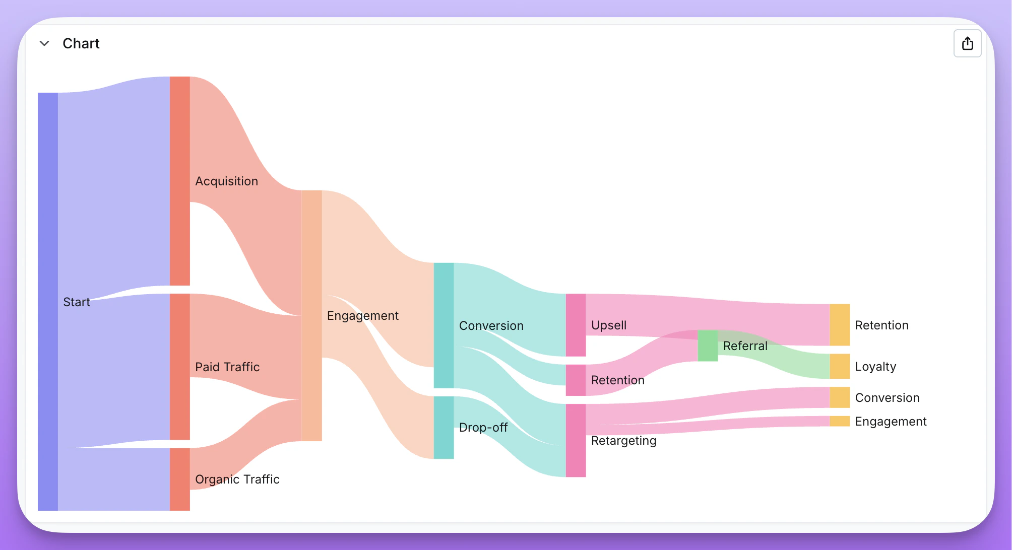 Unlike traditional Sankey implementations, Lightdash supports cyclical data where flows can loop back. For example, in a retargeting funnel:- Awareness β Consideration