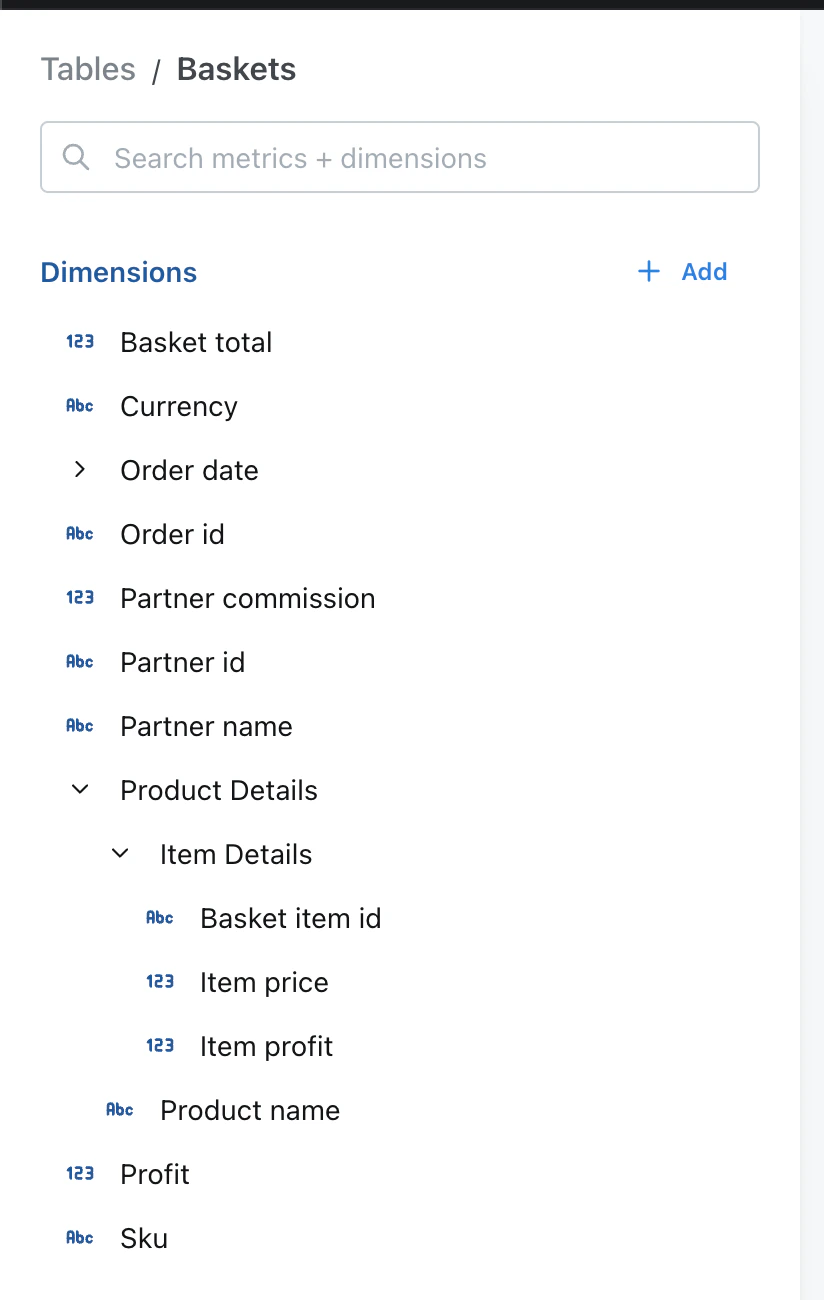 | groups | No | string or string[] | If you set this property, the dimension will be grouped in the sidebar with other dimensions with the same group label. |
