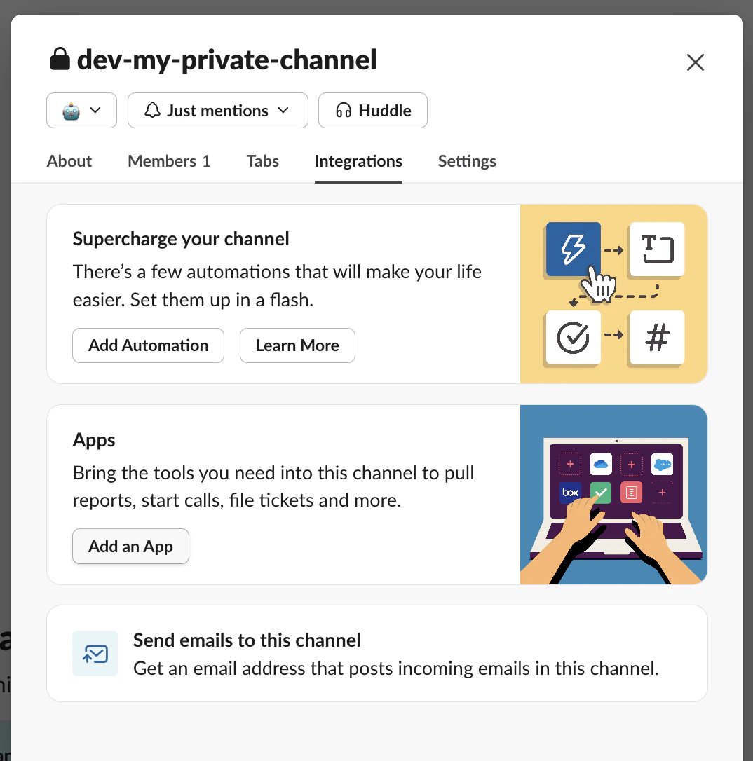 • Use channel settings - Click on the channel name, go to Integrations > Add an app, then search for and add Lightdash