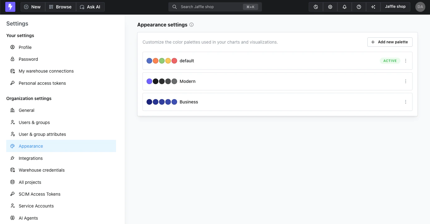 You can configure different color palettes for light mode and dark mode to ensure optimal contrast and readability in each theme. The appearance configuration includes separate tabs for both light mode and dark mode, allowing you to customize color schemes for each theme independently. Since dark mode is available as a user preference setting within the app, having separate palettes ensures your charts look great regardless of which theme users choose. Note that dark mode is only available when using the app directly - embedded charts, Slack integrations, and other external integrations will continue to display in light mode.